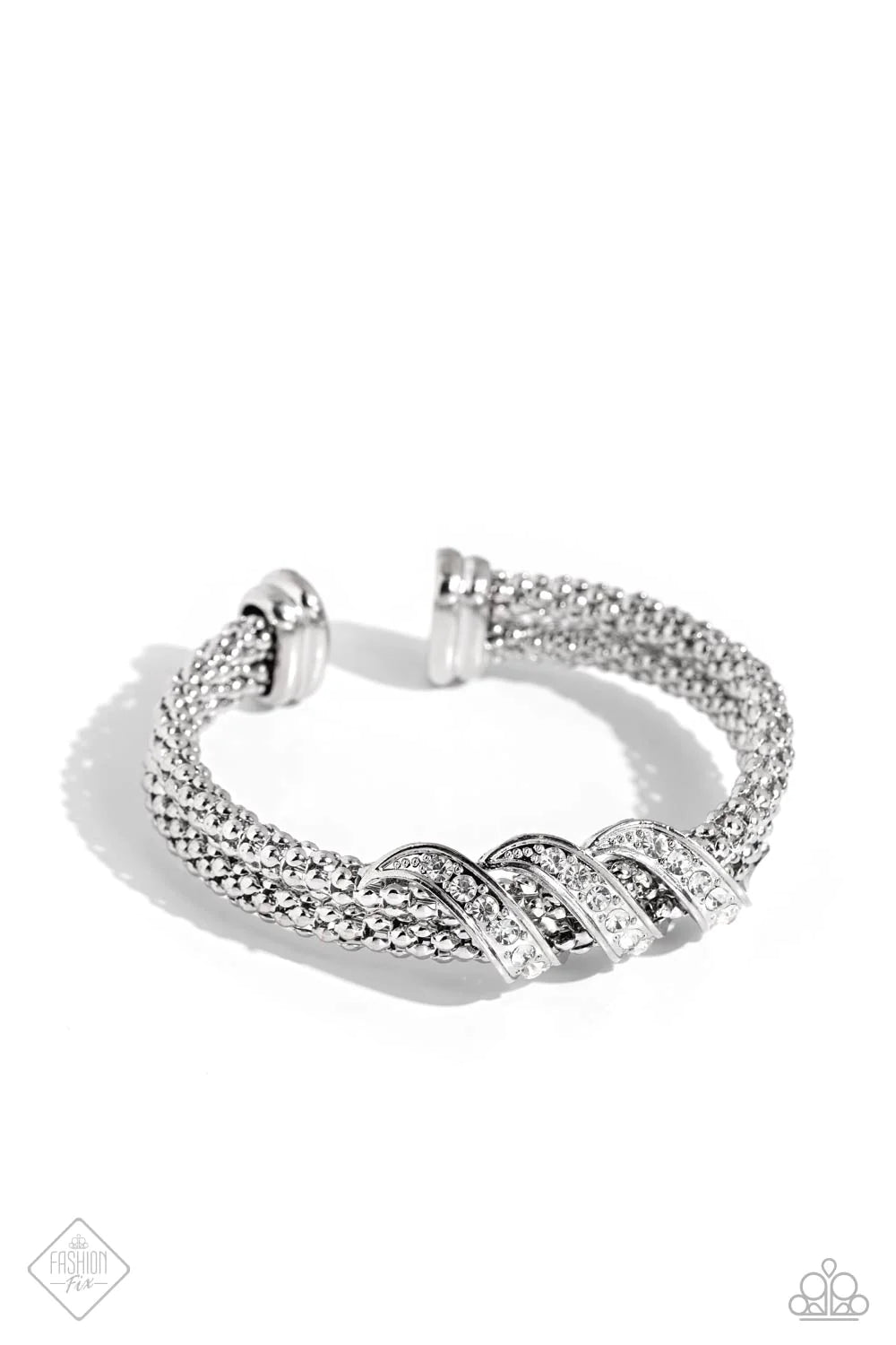 Two stud-embellished, bendable strands of silver stack atop one another and wrap around the wrist for a tantalizing, tactile display. Three swirls of silver, featuring glittery white rhinestones, curl around the center of the monochromatic display for a finishing touch of shimmer.