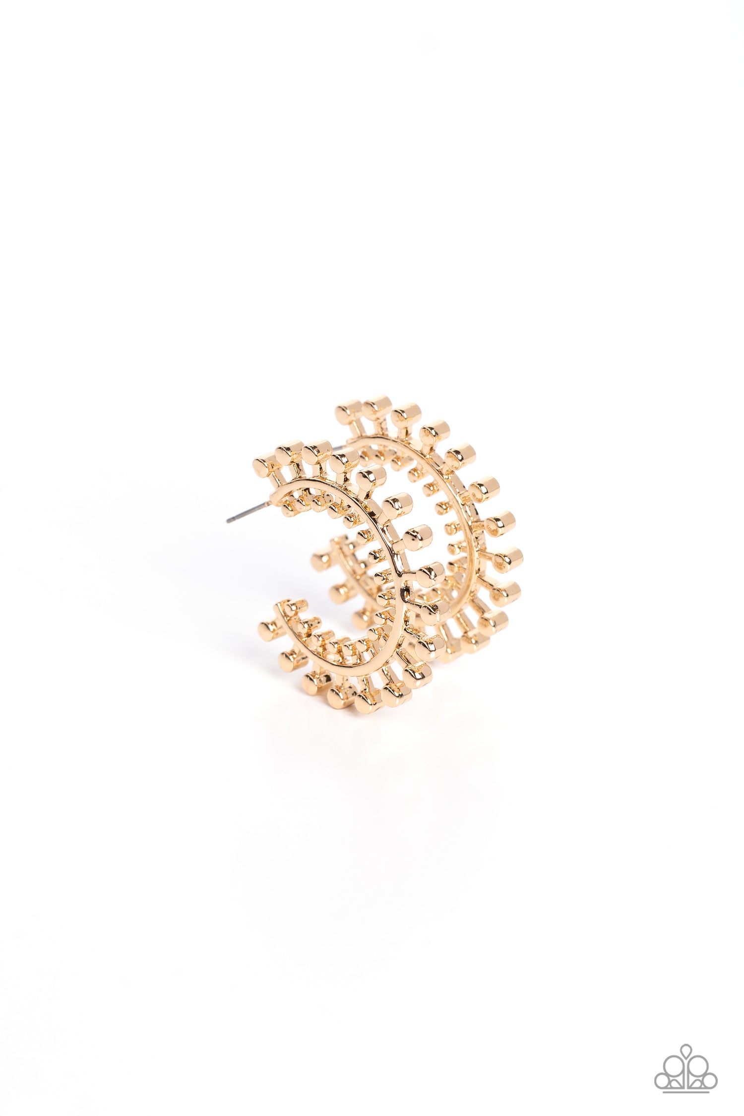 Tactile gold studs fan out along a classic gold hoop, erupting into a brilliant display of texture and sheen. Smaller studs line the inner edge of the hoop, adding additional eye-catching detail to the adventurous design. Earring attaches to a standard post fitting. Hoop measures approximately 1 1/4" in diameter.