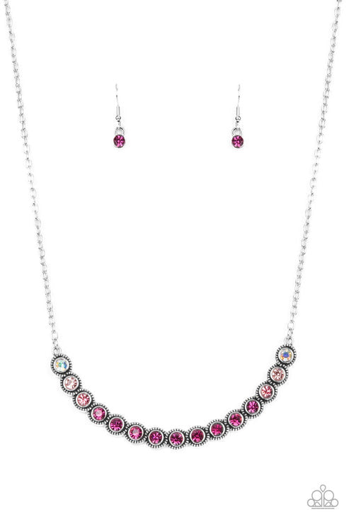Encased in studded silver fittings, a glittery ombré of pink rhinestones delicately bows below the collar, creating an enchanting pop of color. Features an adjustable clasp closure.