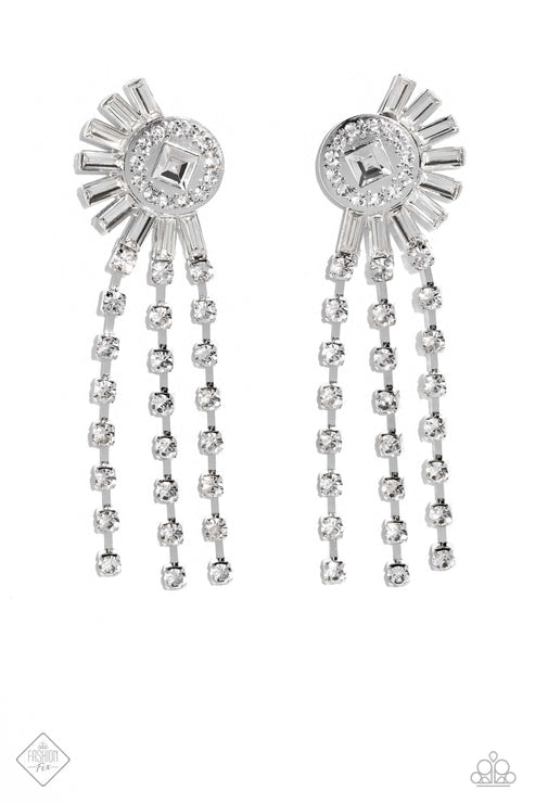 Encased in square silver fittings, three strands of dainty, glistening, white gems cascade from a blindingly ornate circular frame. Emerald-cut white gems explode from the rhinestone-dusted frame for additional eye-catching light and sheen. Earring attaches to a standard post fitting.