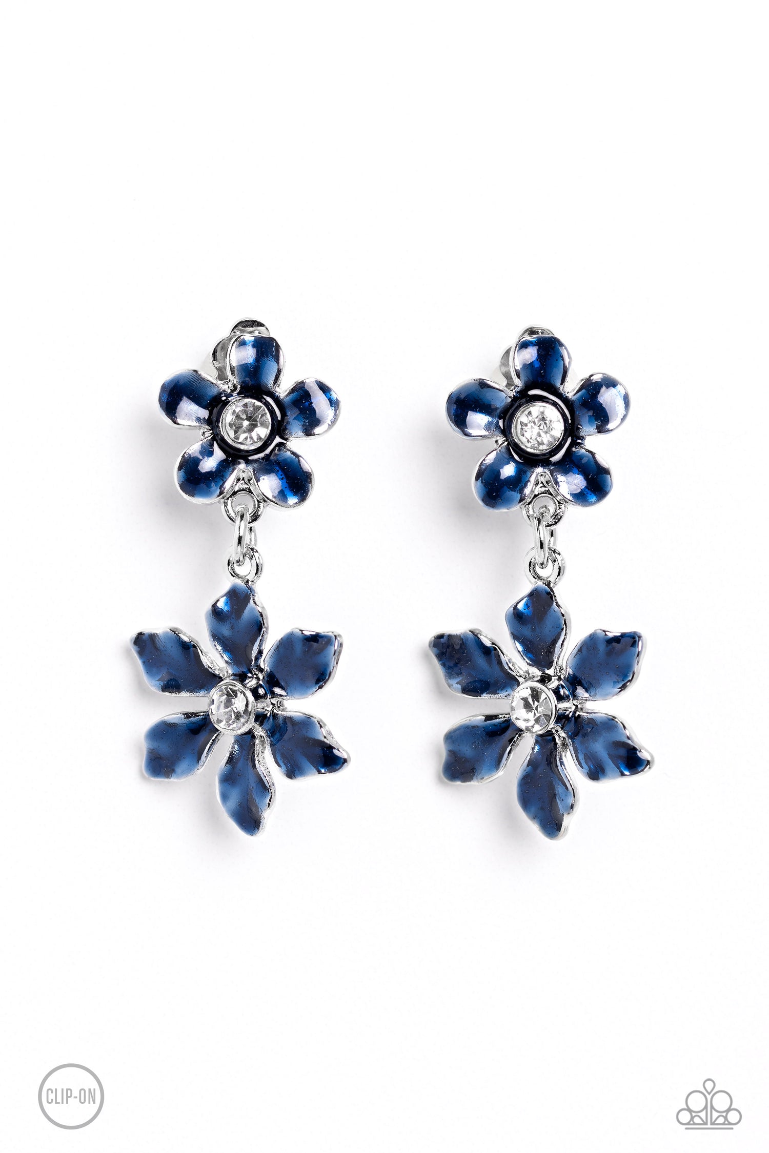 A navy transparent flower with pinched petals blooms around a glittery white gem center. The large flower swings from a second transparent navy flower, featuring a smaller size with fanned-out petals encircling a glittery white gem center. The elements combine to create a whimsical lure rich in character. Earring attaches to a standard clip-on fitting.