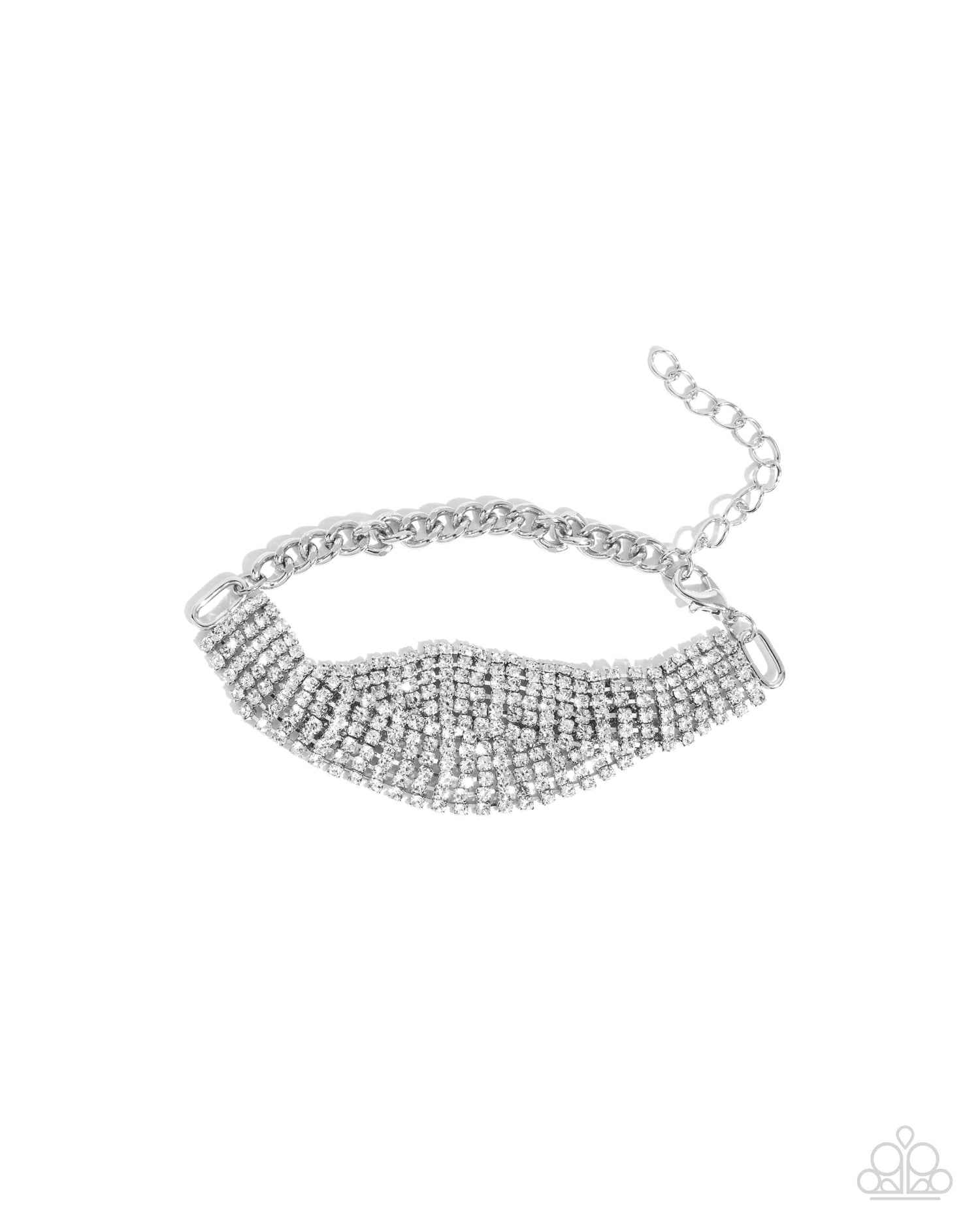 A cascade of sparkling rhinestones fans out across the wrist, creating a dazzling, shimmering centerpiece. Connecting to a chunky silver chain adds contrast and adjustability. Features an adjustable clasp closure.
