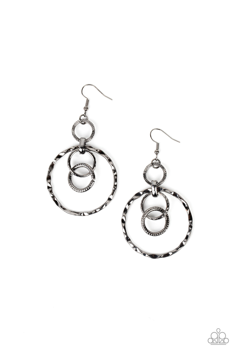 A hammered gunmetal hoop is threaded through a chain of mismatched textured gunmetal links, resulting in an intense industrial lure. Earring attaches to a standard fishhook fitting.
