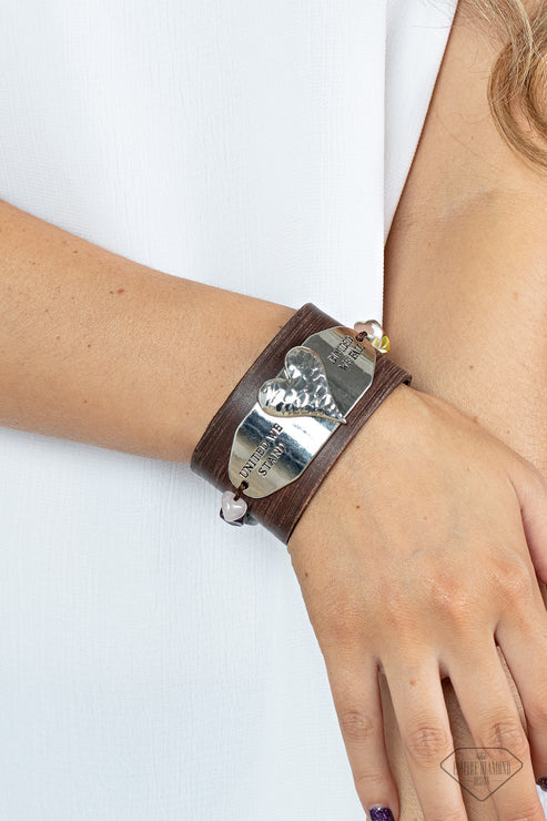 A strand of raw cut multicolored pebbles is threaded through the edges of a curved metal plate, studding the asymmetrical frame in place across the front of a distressed brown leather band. The silver frame is adorned with a hammered silver heart and stamped in the inspiring phrase, "United we stand/Divided we fall." Features an adjustable snap closure.