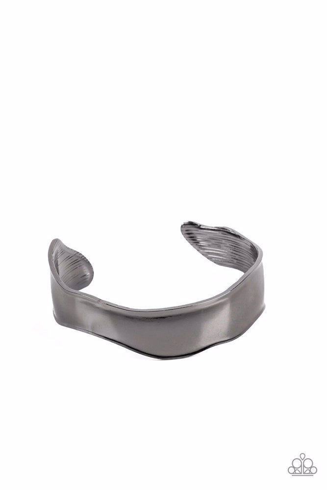 Bordered in raised gunmetal surfaces, a wavy gunmetal cuff asymmetrically curves around the wrist for an edgy vibe.